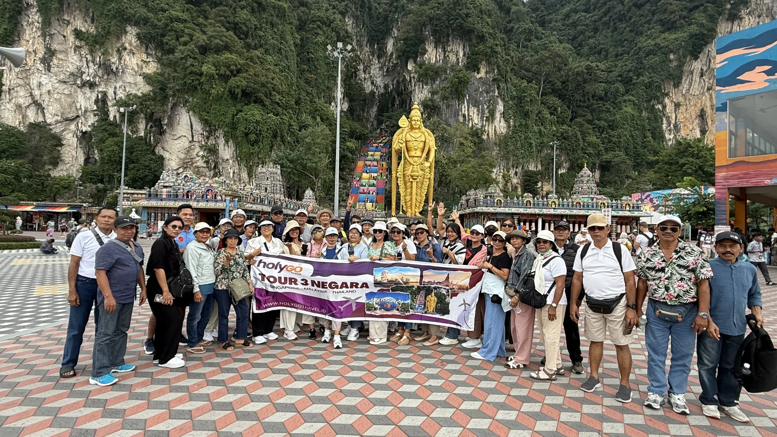 Batu Caves: Situs ikonik dengan patung dewa emas raksasa dan tangga warna-warni yang memikat, dikelilingi oleh perbukitan kapur yang megah.